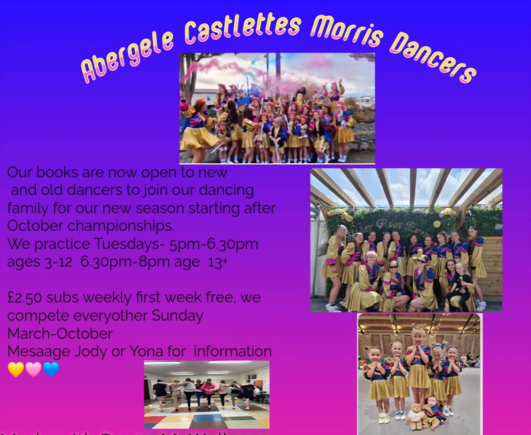 Contact us through our private Facebook pages or the Abergele castelettes one - Jody Jones (principal) Yona Hughes - Wiles (vice principal)